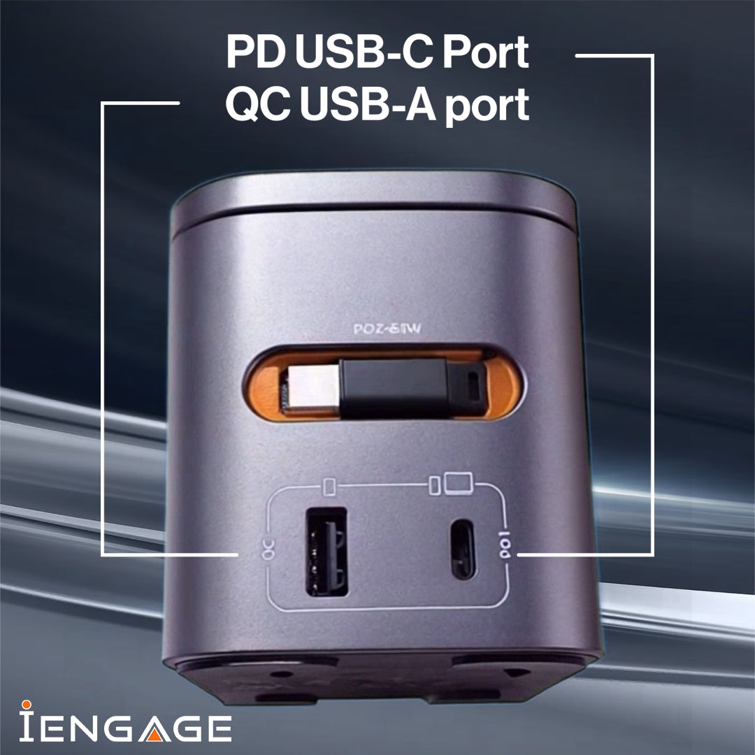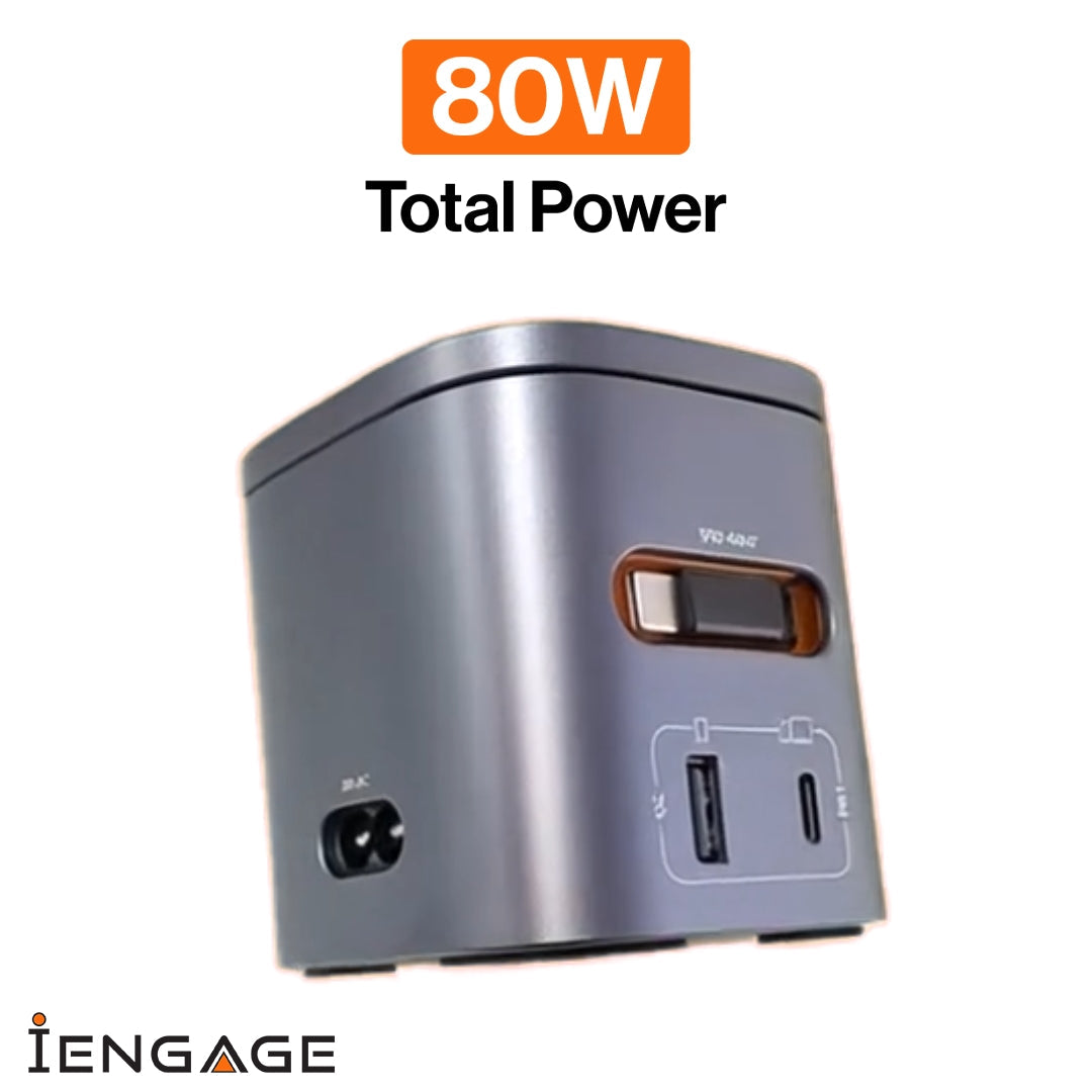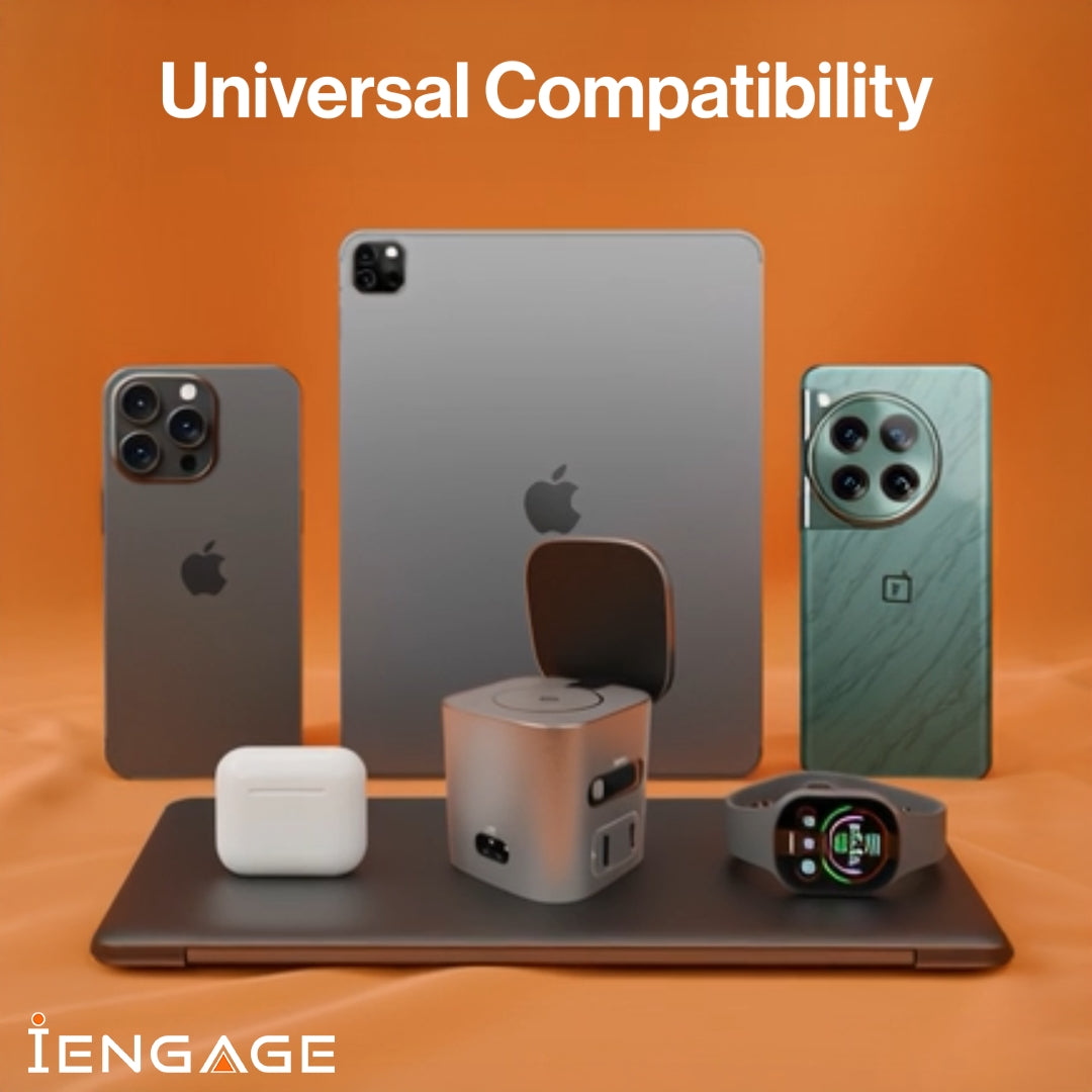 Experience next-level convenience with the IENGAGE 6-in-1 GaN Desktop Wireless Charger. Designed to power up to 6 devices simultaneously, it combines super-fast 80W wired charging and 15W wireless charging in one sleek solution. With a built-in retractable USB-C cable, upgraded coil, and advanced GaN technology, it ensures efficient and safe charging every time. Compact, stylish, and clutter-free, this desktop charger is the perfect all-in-one solution for smartphones, tablets, laptops, and more.